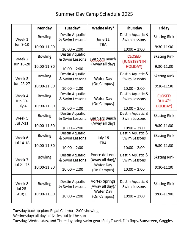 A summer, academic-enrichment program for preschoolers. Each week, there is educational instruction and a variety of other activities such as crafts, activity centers and occasional trips to the Niceville Children’s Park and Library Story Time. Parents will receive an information packet on the first day.