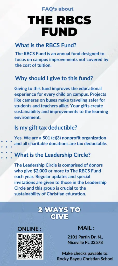 Your gift improves the educational experience of every student on our campus. RBCS is a 501(c)(3) non-profit organization that relies on your gifts in order to be able to make major improvements to facilities and programming. Your gift is tax deductible. The Annual Fund goal is detailed above. We ask that you prayerfully consider making a life changing gift today because every gift makes a difference.